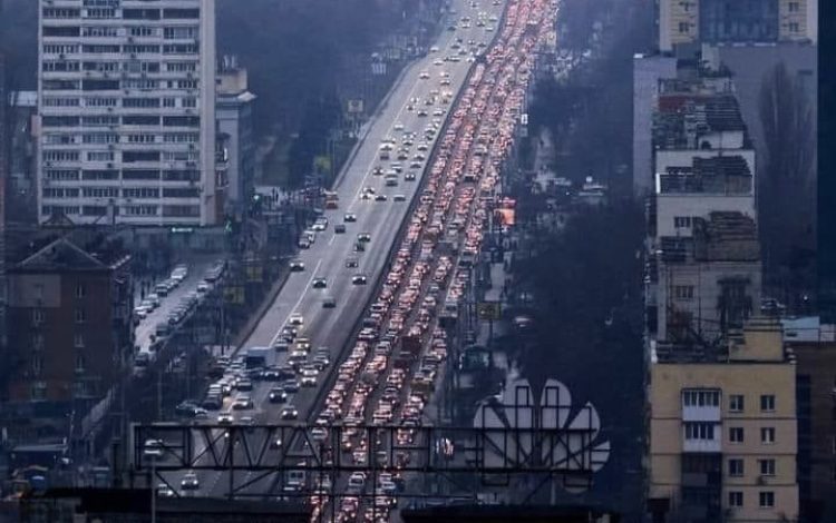 The picture in your view shows that, as Russia began its invasion of Ukraine, lines of cars moved out of the capital, Kyiv, many heading west and hoping to find safety in parts of the country closer to Poland and NATO troops.